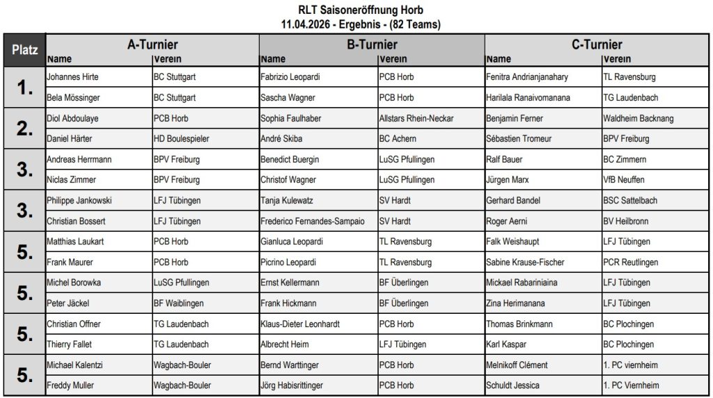 Am 11.04.2026 fand auf der Horber Schütte die Saisoneröffnung statt. Bei herrlichem Frühlingswetter und vom PCB gut präparierten Bahnen fanden 82 Team aus ganz Baden-Württemberg den Weg nach Horb und versuchten möglichst viele Ranglistenpunkte zu ergattern. Das Turnier war wie immer hochklassig besetzt, darunter der Europameister von 2025 Matthias Laukart sowie viele Bundesligaspieler, deutsche und baden-württembergische Meister.