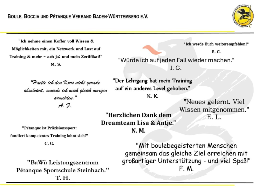 Ende März schlossen 17 Personen ihre Ausbildung zum/zur Trainer*in C Pétanque Breitensport erfolgreich ab. 12 Teilnehmer*innen kamen aus Baden-Württemberg, eine aus Österreich, zwei aus Bayern sowie je einer aus Rheinland- Pfalz und Hessen.